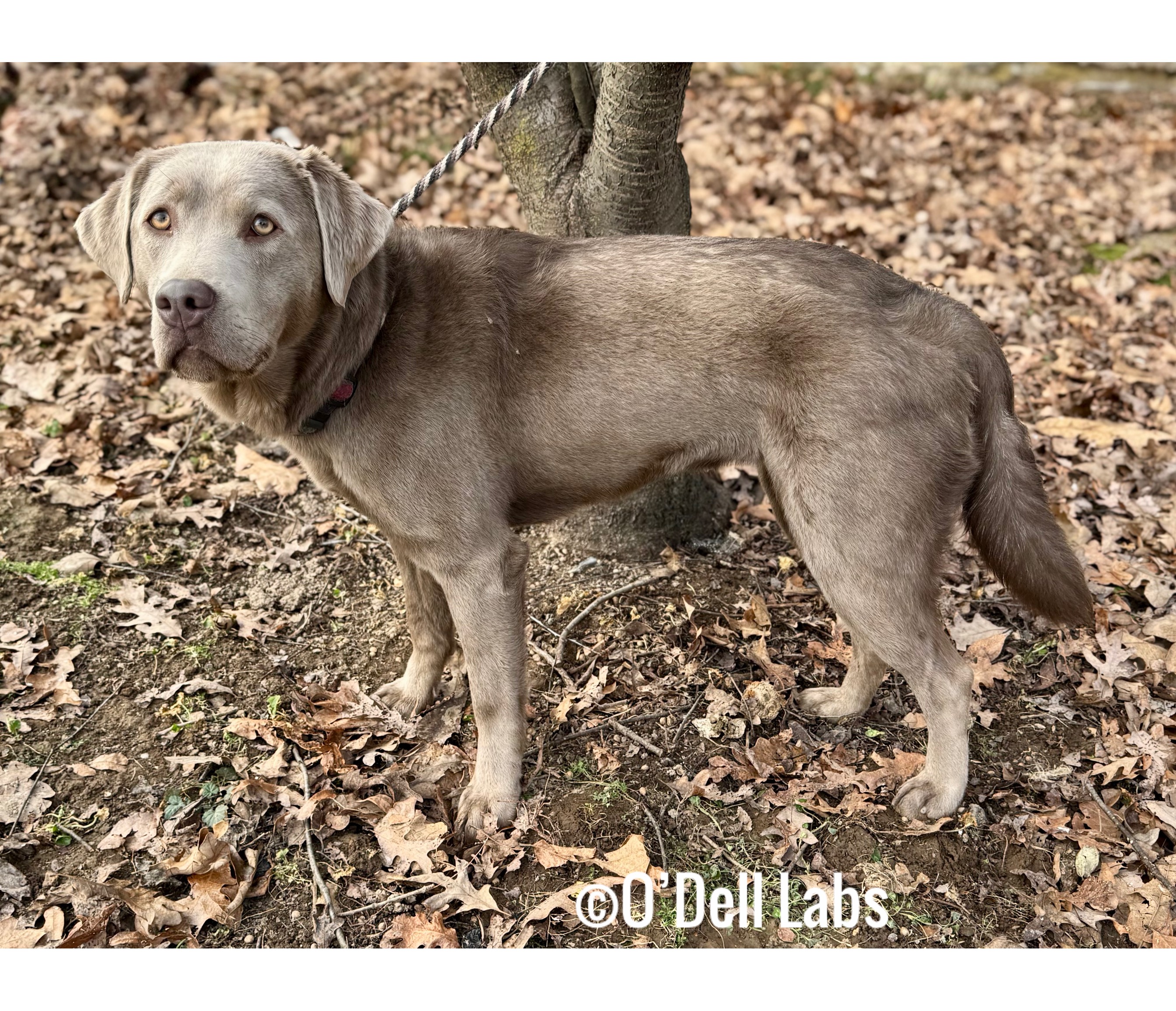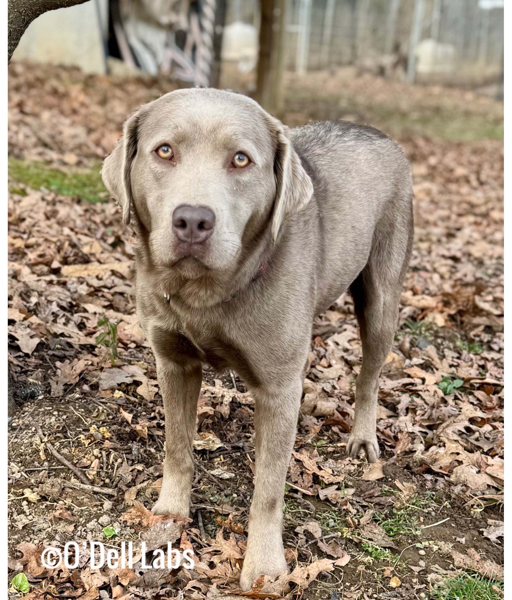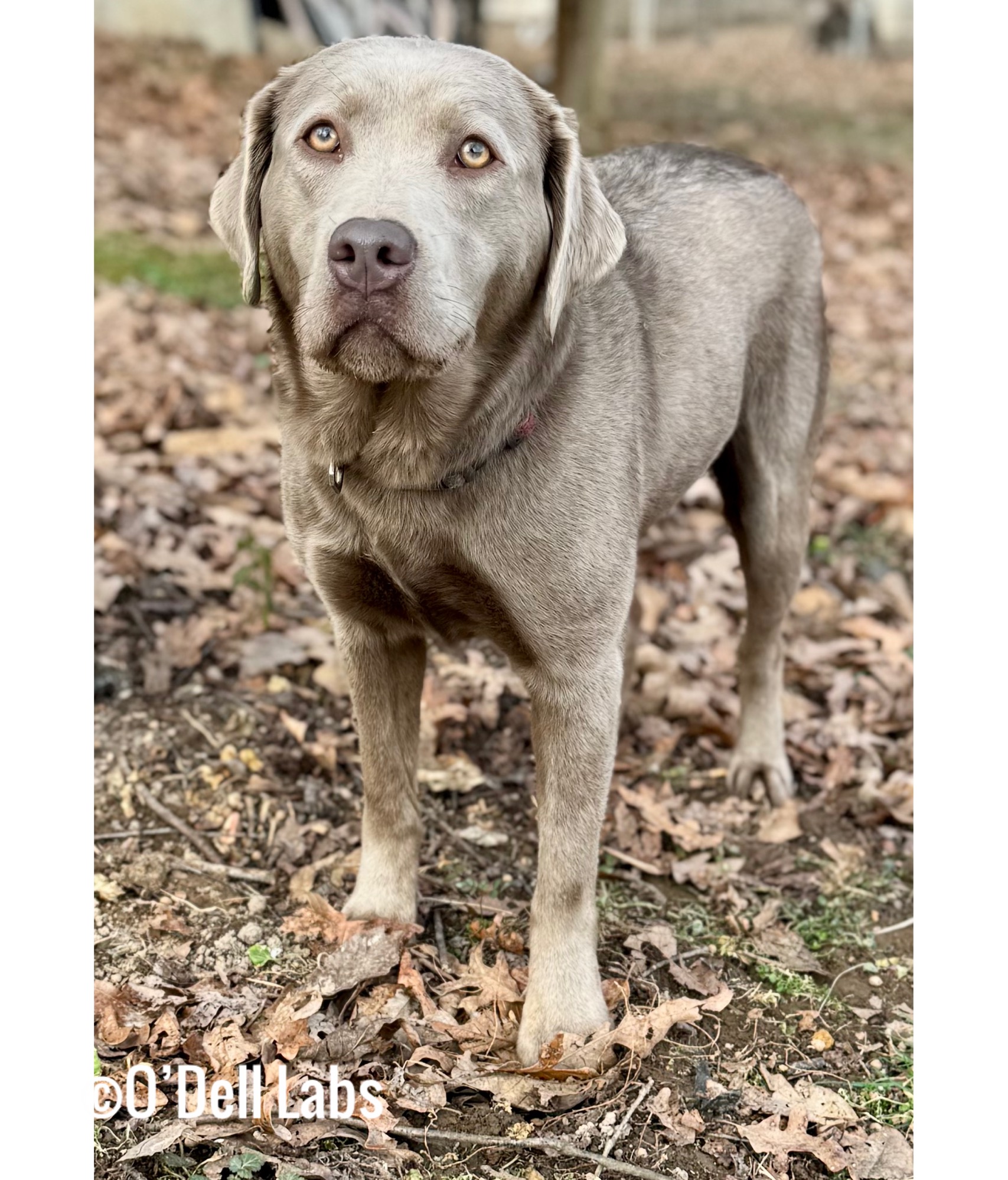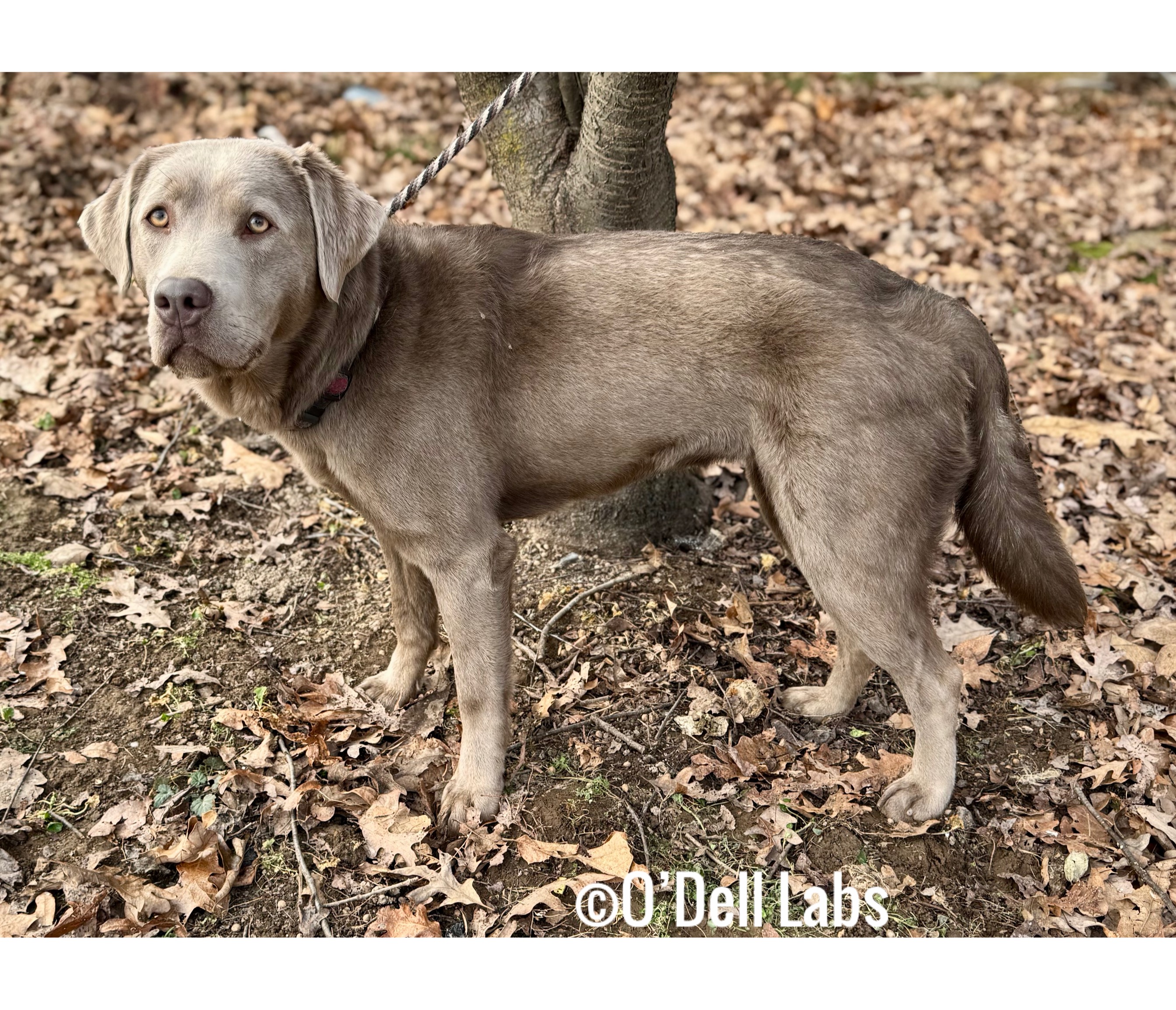 O'Dell's Little Greek Lamb (Agnes), silver girl from Magnolia (Olive x Cash) and Thunder. Aggie is a sweet girl who lives with a friend close by and gets to go to work with him at a local business each day. She carries long coat and yellow, as well as tan points. She is paired with Nash from Hedgelane Labradors from Kansas for her first litter. Expecting chocolate, silver, yellow/champagne with liver noses, and some could be tan points and/or long coat. Aggie has OFA good hips, normal elbows, shoulders, patellas, basic cardiac, and full dentition. Her Embark panel is clear for all diseases/genetic conditions.
