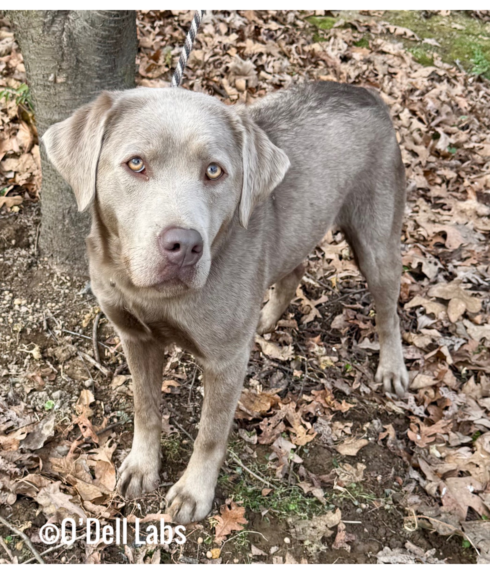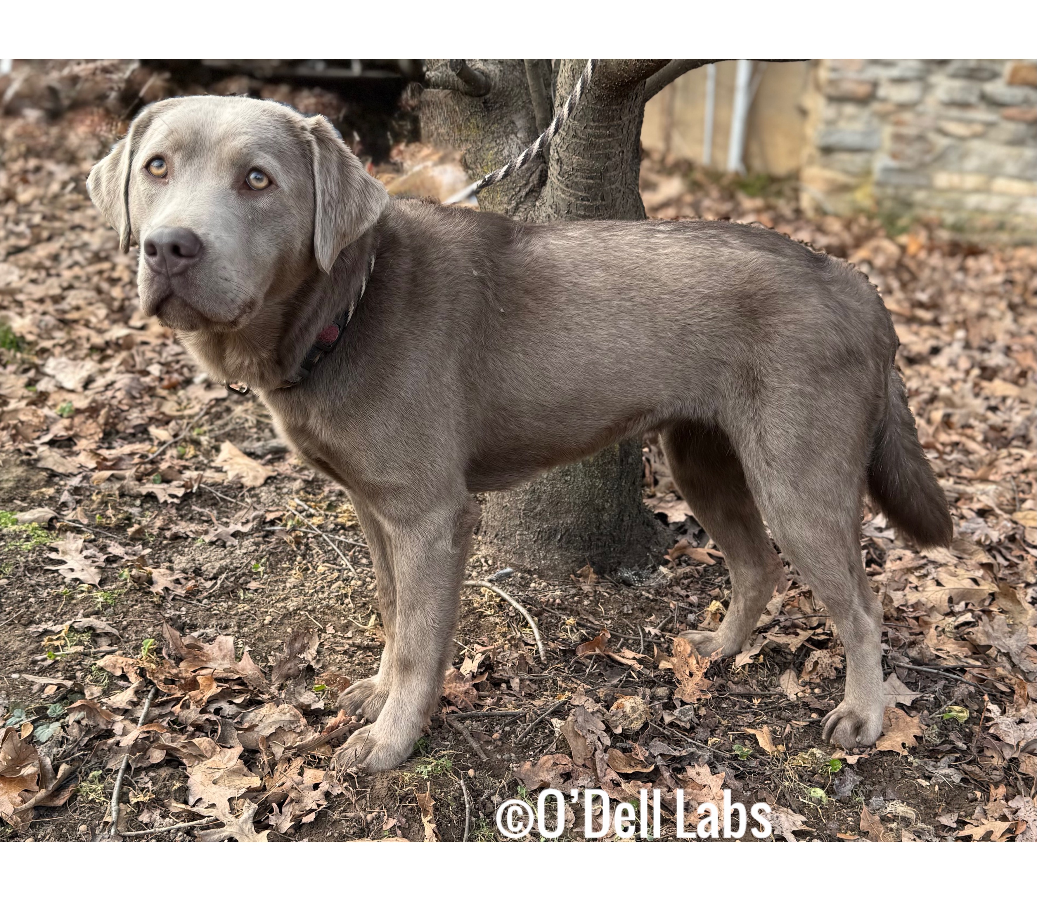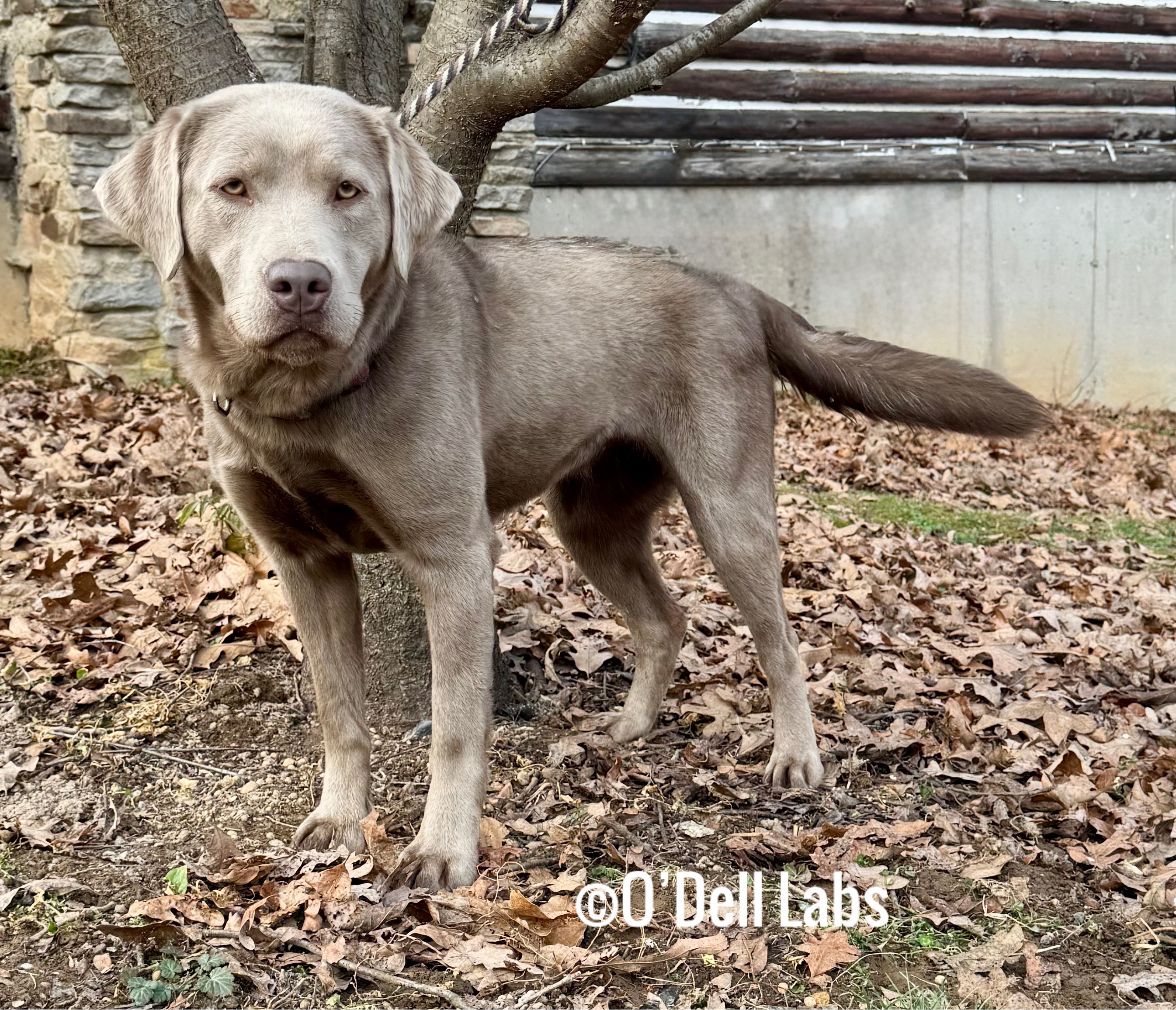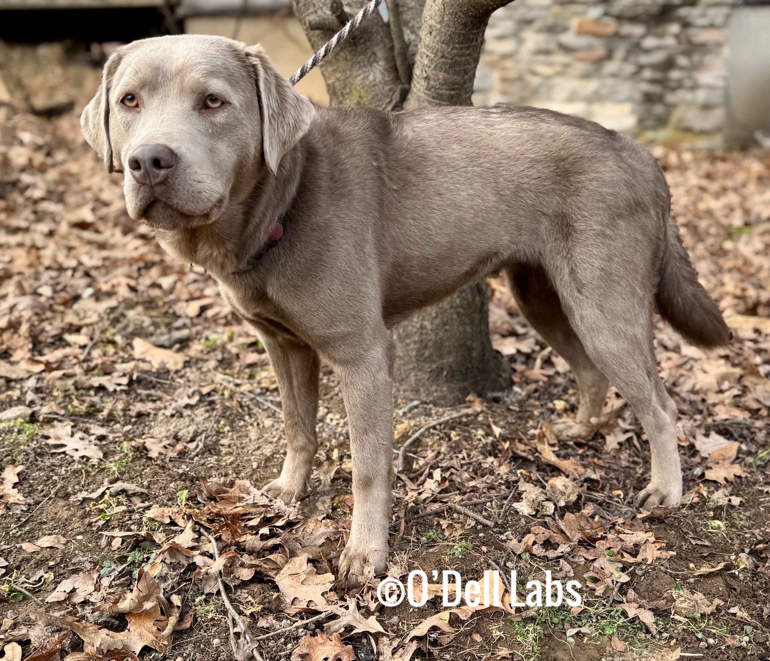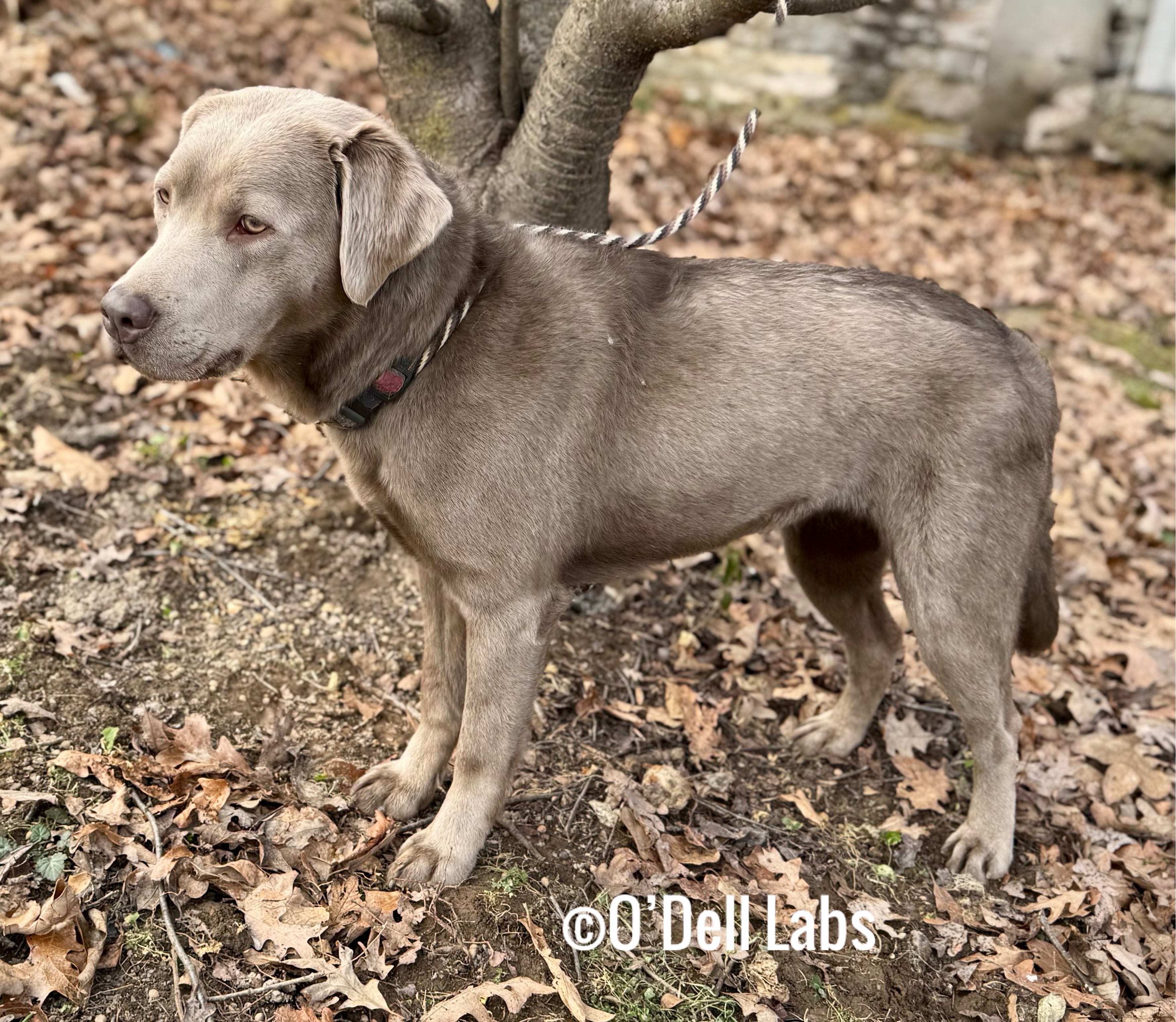 O'Dell's Little Greek Lamb (Agnes), silver girl from Magnolia (Olive x Cash) and Thunder. Aggie is a sweet girl who lives with a friend close by and gets to go to work with him at a local business each day. She carries long coat and yellow, as well as tan points. She is paired with Nash from Hedgelane Labradors from Kansas for her first litter. Expecting chocolate, silver, yellow/champagne with liver noses, and some could be tan points and/or long coat. Aggie has OFA good hips, normal elbows, shoulders, patellas, basic cardiac, and full dentition. Her Embark panel is clear for all diseases/genetic conditions.