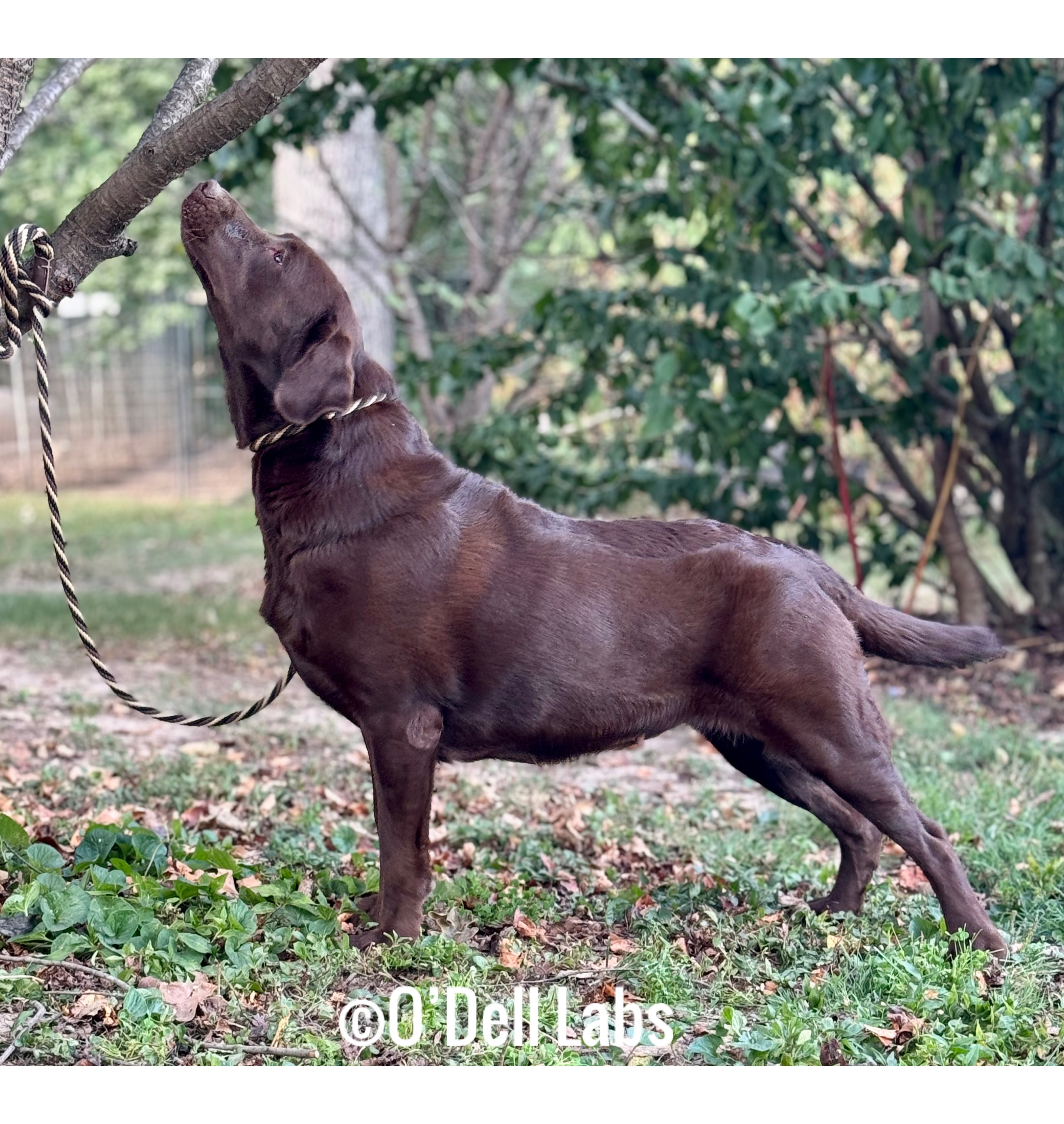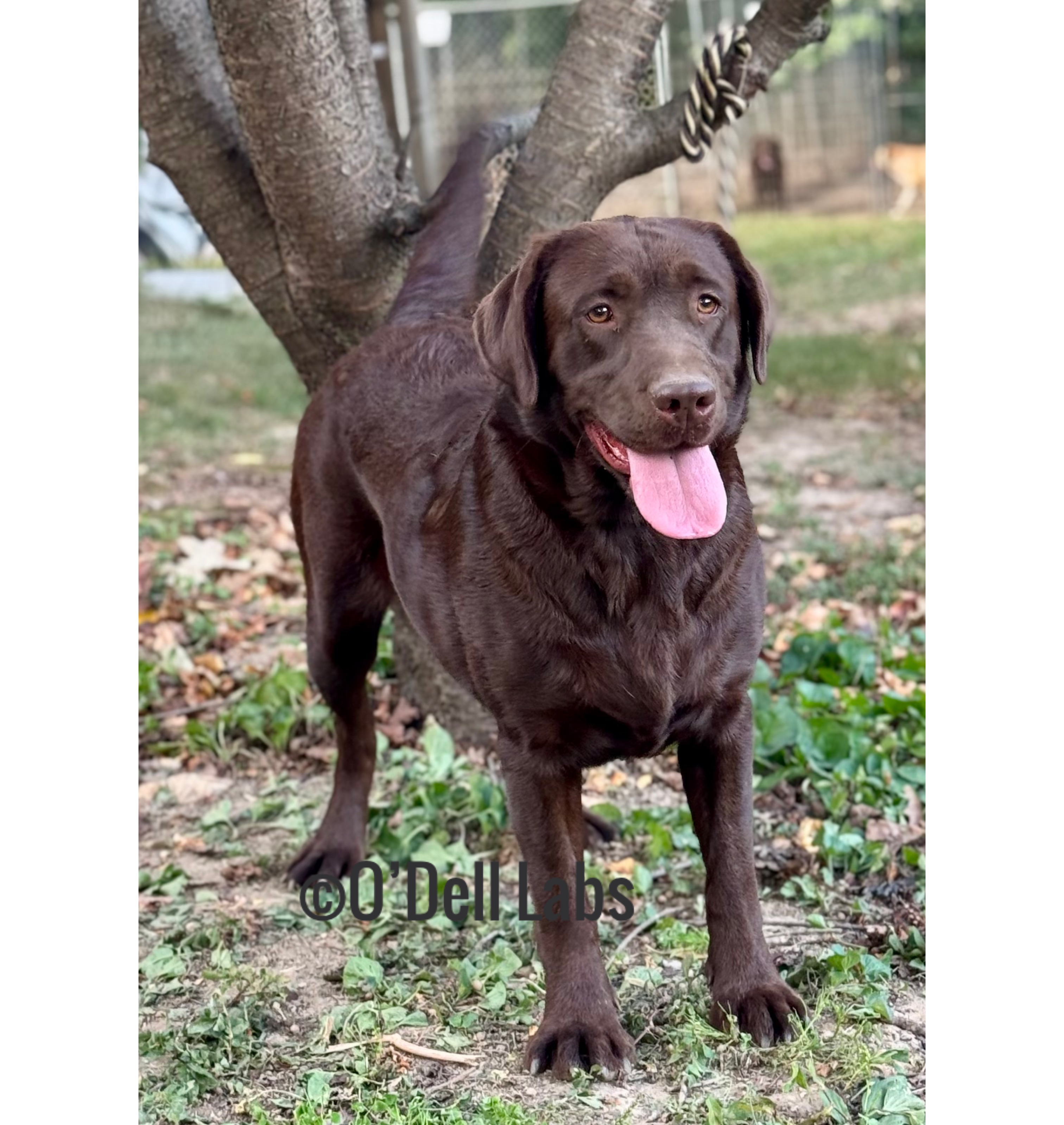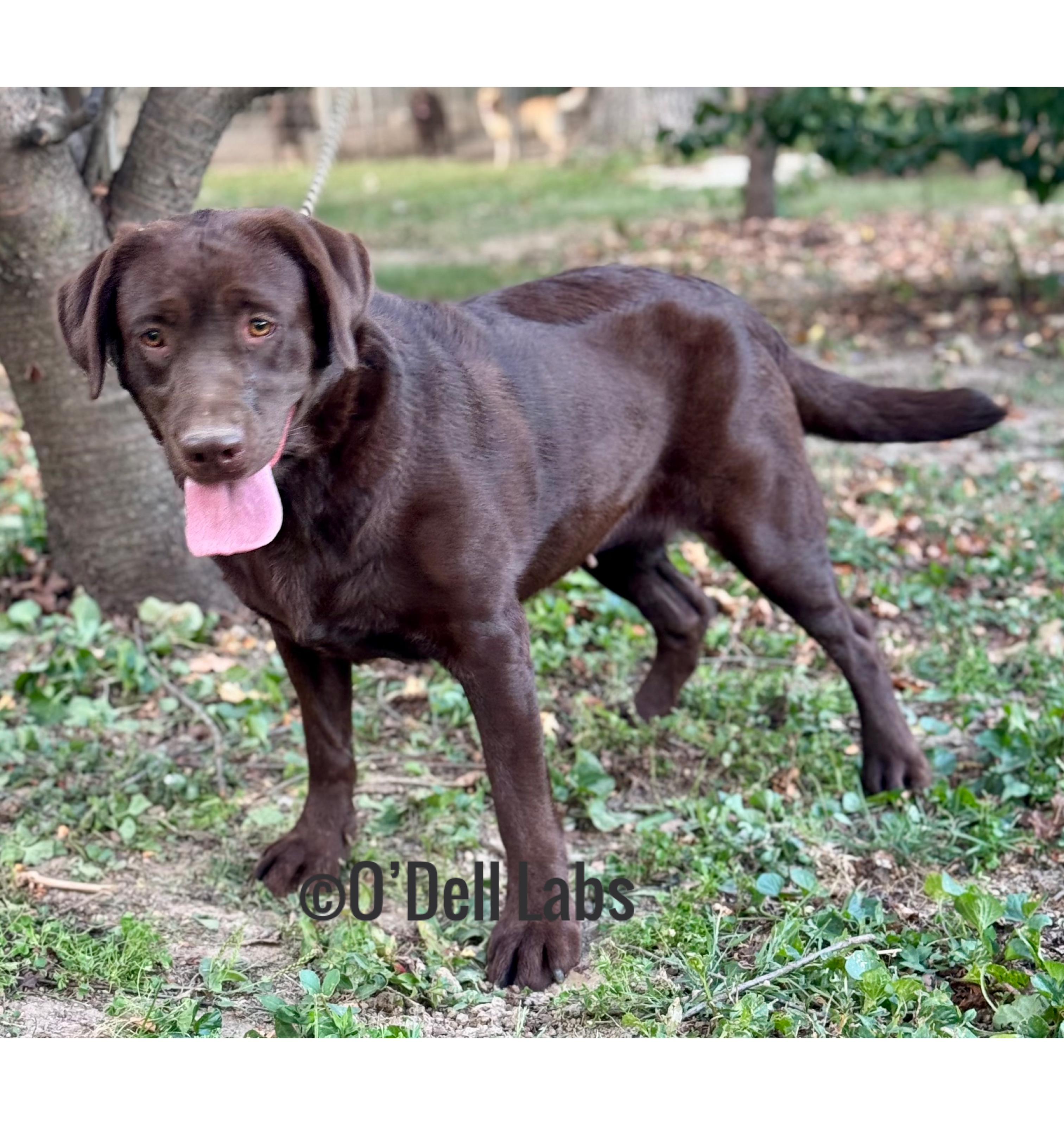 RETIRED:O'Dell's HL Hayleigh (10/20), a chocolate female carrying dilute. Hayleigh came to us from Hedge Lane Labradors in Kansas. She is the epitome of English type. Hayleigh has OFA excellent hips (pre-lim), normal elbows, patellas, shoulders, basic cardiac, and full dentition. Hayleigh is clear on her Embark panel, except she is a nonaffected carrier of HPNK, and none of her pups can be affected since Cash is clear. Hayleigh is clear for Stargardt through PawPrints. Hayleigh has been paired with Fed-ex for an Aug 2025 litter, and this will be her last. She will be retired and stay as our house pet.